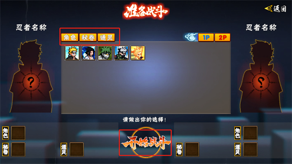 3、此时玩家将会进入到角色、秘卷以及通灵的选择之中,需要为双方角色选择合适的秘卷以及通灵,其后点击【开始对战】按钮;