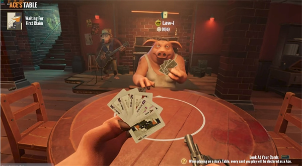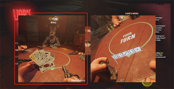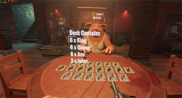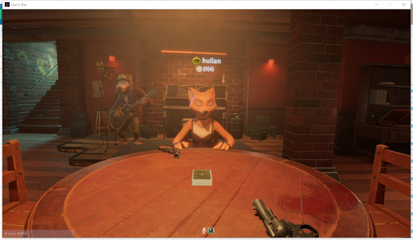 骗子酒馆Liar's Bar是一款非常有趣的心理博弈游戏,类似国内的扑克牌玩法,只不过充满了勾心斗角,你将和四个动物朋友在一个牌桌上去进行比拼,猜中对方的牌是什么,这样就可以让对方乱了阵脚,在昏暗的酒吧中,开启第一人称的精彩对决,每个人每局都会有五张手牌,需要靠蒙和唬让自己通过,如果被人开牌,且跟需要放的牌不一致,那么就需要使用自己的左轮对着自己开枪,但是左轮中只有一发子弹,也就是说你如果运气好,还可以继续牌桌对决,看你的运气和胆量了。