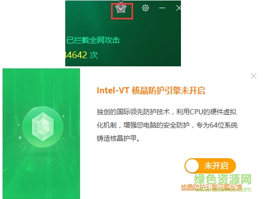 ②打开护盾中心,点击软件右上角的奖牌图标,将Intel-VT何晶防护引擎关闭就可以了。