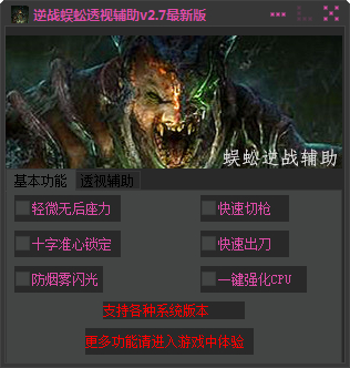 蜈蚣逆战辅助是为热门网络游戏《逆战》打造的辅助工具。软件功能强大,为玩家提供自动开启、自动爆头、方框透视、快速出刀等功能。软件还可以优化CPU,让玩游戏更流畅。好的操作需要好的环境支持,卡屏延迟怎么玩的好!赶快下载体验吧!