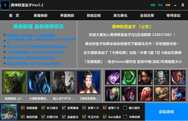 lol男神联盟盒子是一款强大的英雄联盟辅助工具,主要为用户提供英雄换肤、界面换肤、无限视距等功能服务,该软件绿色免费不封号,有需要者欢迎下载!