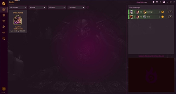firestone记牌器是专门为炉石传说玩家设计的辅助软件,在功能中提供了丰富的辅助工具使用,可以分析游戏中的卡牌情况,手机自己喜爱的卡组和游戏道具,带来了一个不错的辅助工具使用体验。根据玩家的需求不断发展,提供一个专业、全面、可靠的游戏数据查询与辅助工具,将帮助广大炉石玩家更好地了解自己的游戏情况、提高决策水平,并为玩家提供丰富的功能支持,享受到游戏的乐趣和创新性。