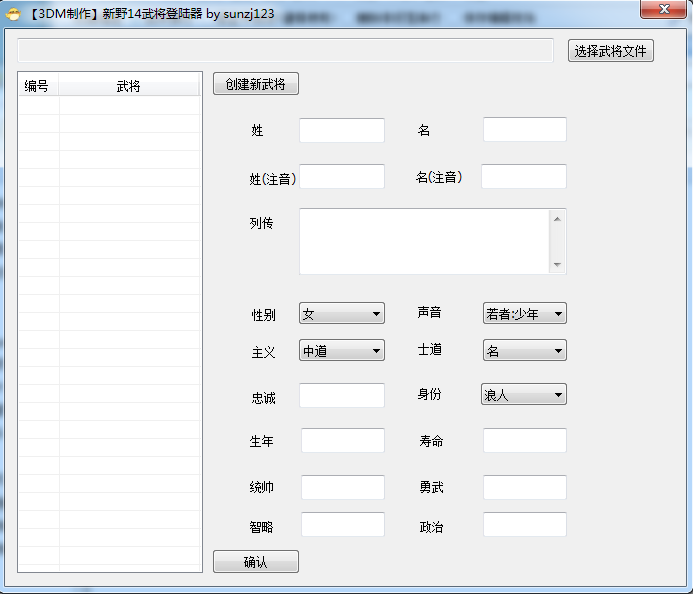 3、新建武将:点击新建按钮,填写武将信息,点击确定按钮,创建成功