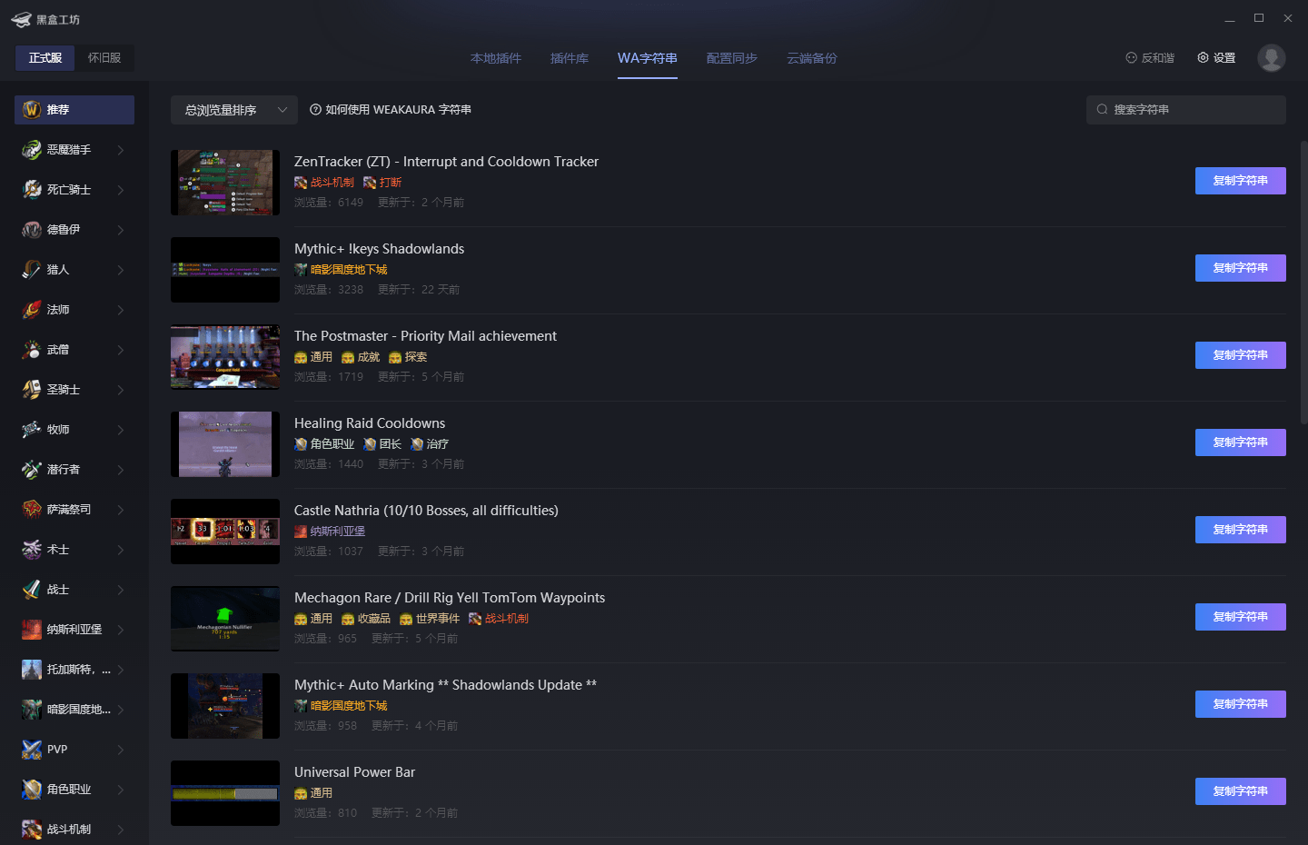 小黑盒工坊官方版支持正式服和怀旧服,登录你的小黑盒账号就可以同步你的插件数据。软件中的插件都是最新的,而且针对不同的职业还有专属wa字符串和专属插件。插件很全面,欢迎下载体验!