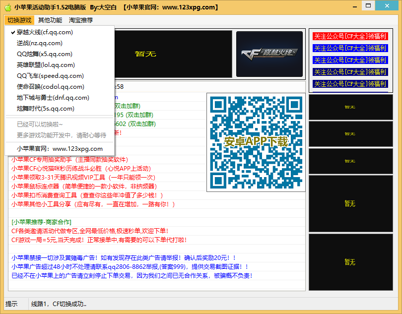 小苹果活动助手是一款网游活动道具领取软件,不仅是穿越火线,现在还有qq飞车、英雄联盟等活动,支持一键自动领取活动福利道具,操作简单,赶快下载使用吧!