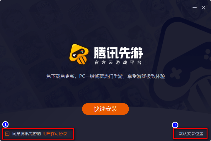 2、勾选“同意腾讯先游的 用户许可协议”,点击“默认安装位置”