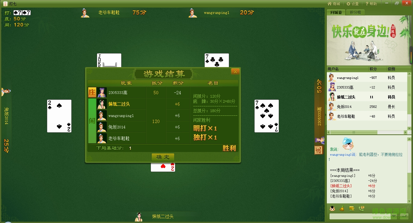吕梁同城游打7是一款非常有意思的吕梁本地棋牌游戏,因为每一局都是打7,级牌只有7,故而得名打七。游戏由五位玩家组成,每局牌有一个或者二个玩家是“庄家”,独自对抗另四个组成同盟的玩家,或者与亮的相同牌的玩家为队友。