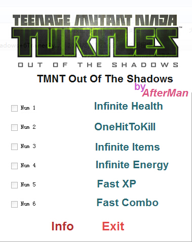 忍者神龟脱影而出修改器是专为动视游戏《忍者神龟:脱影而出》打造的作弊工具,提供无限生命、无限能量、快速涨经验值扥功能,还可以让玩家快速涨连招数,无限释放技能接无限连招,体验更炫酷的操作。