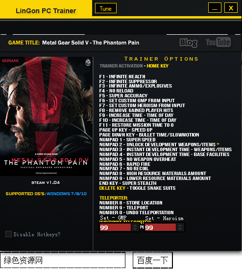 合金装备5:幻痛修改器是专门为合金装备玩家制作的游戏修改工具,具有无限生命,无限消声器等多种游戏功能,让你在游戏中无所不能,有需要的 玩家赶紧下载吧!