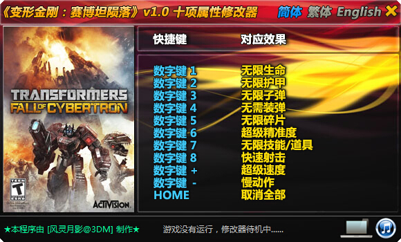 变形金刚赛博坦的陨落修改器风灵月影是由玩家风灵月影专为游戏《变形金刚:塞伯坦的陨落》制作的辅助工具,可提供无限护甲、无限生命、无限技能、无限道具等十项功能,无限道具使用,技能更是满天飞,体验更刺激的游戏玩法。