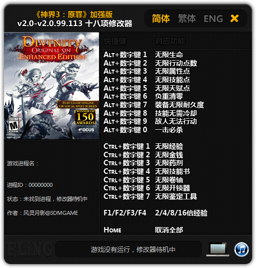 神界3原罪加强版修改器风灵月影是由网络大神风灵月影专为《神界3:原罪加强版》打造的修改工具。软件功能强大,支持v2.0-v2.0.99.113版的使用,提供无限生命、无限天赋点、负重清零、无限经验等十几项功能。赶快下载体验吧!