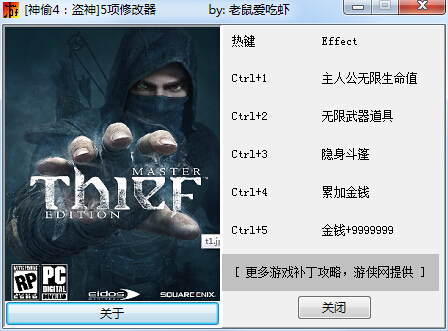 神偷4全版本五项修改器是《神偷4》一款非常实用的修改器。可能在功能上不算多,提供无限生命、无限金钱、无限武器道具等五项功能,但是修改器支持所有游戏版本的使用,通用性极强。赶快下载体验吧!